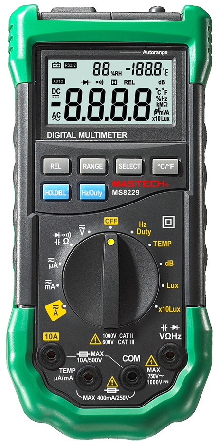 Цифровой мультиметр Mastech MS8229 позволяет измерять напряжение переменного/постоянного тока, переменный/постоянный ток, сопротивление, частоту, относительную длительность импульса, емкость, а также осуществлять проверку диодов и "прозвонку" цепи. На ЖК-дисплее одновременно отображаются результат измерения и символ единицы измерения.