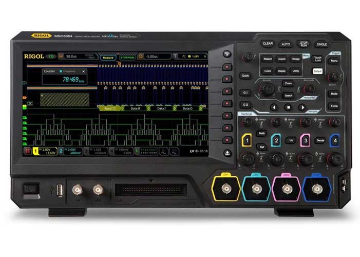 Цифровой осциллограф MSO5354 сочетает в себе до семи измерительных приборов: цифровой осциллограф, 16-канальный логический анализатор, анализатор спектра, двухканальный генератор сигналов, цифровой вольтметр, 6-разрядный частотомер, анализатор протоколов. Осциллограф MSO5354 использует новейший процессор "Phoenix", разработанный компанией Rigol. Это обеспечивает частоту дискретизации в реальном времени до 8 Гвыб/с, а технология UltraVision 2 позволяет увеличить размер глубины записи до 200 М точек, скорость захвата осциллограмм до 500000 осц/с, а максимальный размер кадров при анализе осциллограмм до 450000. В цифровом осциллографе MSO5354 применен большой сенсорный дисплей, что наряду с традиционными органами управления на передней панели прибора делает пользовательский интерфейс простым и удобным, а также предоставляет возможность использовать зональный триггер.