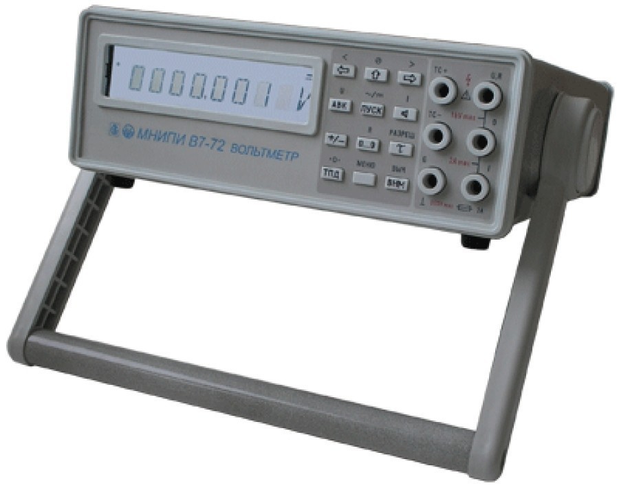 Вольтметр универсальный цифровой В7-72 - малогабаритный прибор высокого класса точности с большими функциональными возможностями и малым энергопотреблением. Предназначен для измерения постоянного напряжения, среднеквадратического значения переменного напряжения, силы постоянного тока, силы среднеквадратического значения переменного тока, электрического сопротивления постоянному току. Вольтметр обеспечивает хранение до 500 результатов измерений во внутреннем ОЗУ, математическую обработку результатов измерений (10 программ), содержит цифровой фильтр.