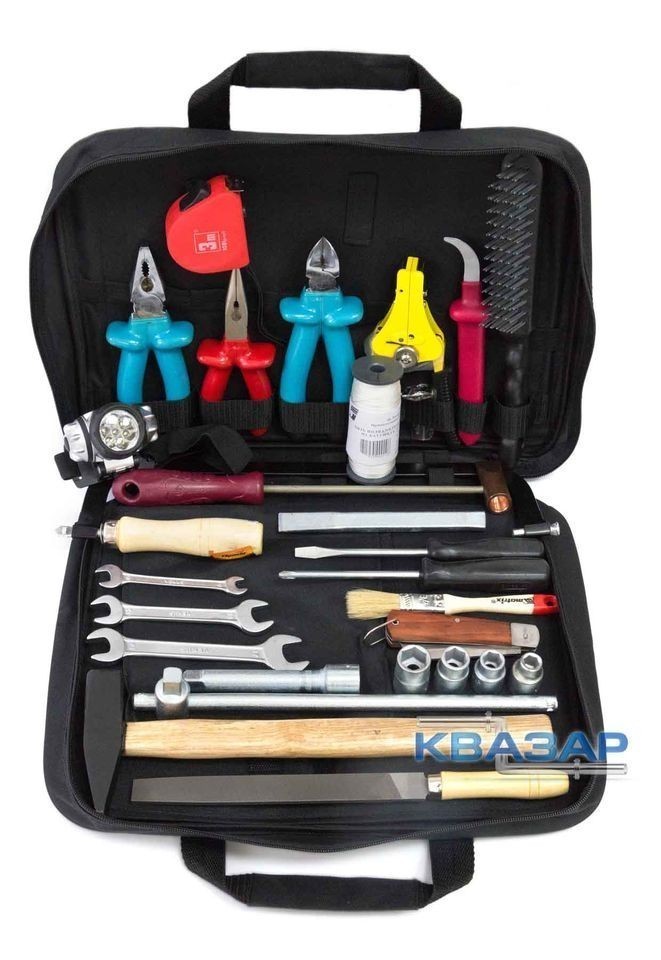 Набор кабельщика-спайщика №2 состоит из 29 предметов, в том числе длинногубцев, кусачек, пресс-клещей, паяльника, отверток, рожковых ключей, торцевых головок, ножей, ножовки по металлу, зубила.