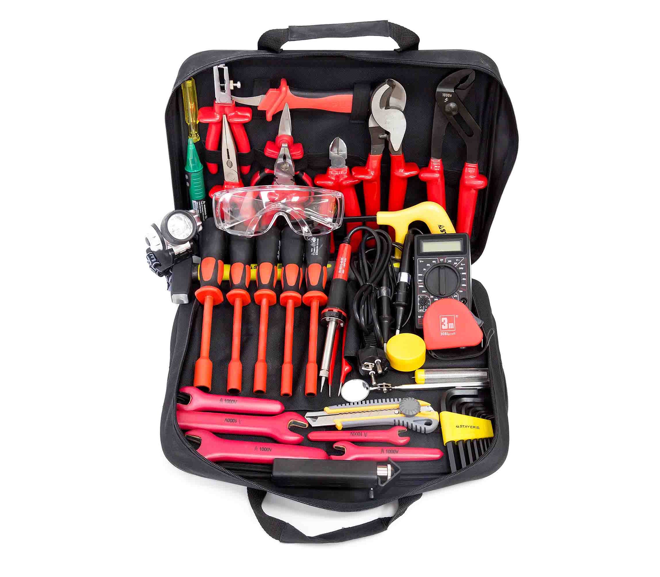 Отвертка индикаторная, Ручка шариковая, Паспорт, Блокнот для заметок, Рулетка 3 м, Изолента ПВХ 1 рул, Зубило 160 мм, Индикатор напряжения ПИН-90-М до 1000В, Фонарь налобный, Сумка, Подставка под паяльник, Паяльник 220В/40Вт, Кисть, Кусачки боковые 160 мм изолированные до 1000В, Канифоль Перчатки диэлектрические до 1000В 1 пара, Зеркало телескопическое, Тонкогубцы 160 мм изолированные до 1000В, Пассатижи 160 мм изолированные до 1000В, Перчатки трикотажные ПВХ 1 пара, Очки защитные 1 пара, Инструмент для снятия изоляции и оболочки с круглых жил КС-25 диам. 4,5-25 мм, Нож с сегментированным лезвием 25 мм, Набор изолированных отверток НИО-1107, Детектор переменного напряжения, Клещи переставные 250 мм изолированные до 1000В, Мультиметр цифровой DT-832, Кабелерез 250 мм диам. до 25 мм изолированный до 1000В, Набор имбусовых ключей Нож НМИ-02 с защитной крышкой изолированный до 1000В, Припой Молоток 0,3 кг с фибергласовой ручкой, Ножницы универсальные НИУ-01, Ножовка 150 мм, Пассатижи для зачистки изолированные до 1000В, Набор ключей рожковых односторонних изолированных до 1000В Хомуты нейлоновые 200 мм 1 упак, Пинцет прямой изолированный до 1000В, Отвертки торцевые изолированные до 1000В НИО-5505Т 5 шт, Длина 390 мм, Высота 290 мм, Глубина 150 мм, Масса, не более 7,5 кг