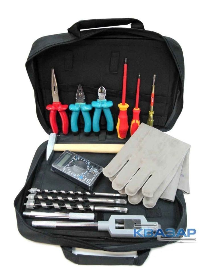 Набор включает в себя изолированные длинногубцы, плоскогубцы и кусачки, диэлектрические отвертки, сверла по дереву, мультиметр, молоток, диэлектрические перчатки — всего 13 видов инструмента.