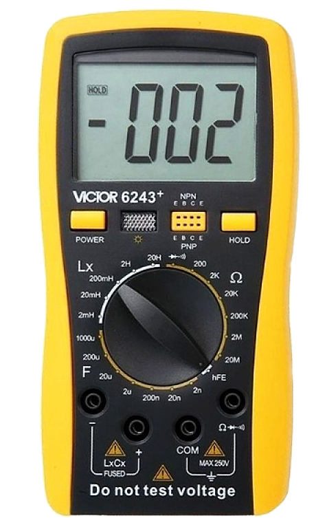 Victor 6243+ представляет собой надежный цифровой измеритель LCR (емкости, индуктивности и сопротивления) с питанием от 9 В батареи и ЖК-дисплеем на 3½ разряда. Прибор может широко использоваться для измерения индуктивности, емкости, сопротивления, проверки диодов, транзисторов и "прозвонки" цепи. Это – идеальный измерительный прибор для производства, лабораторного и бытового применения.