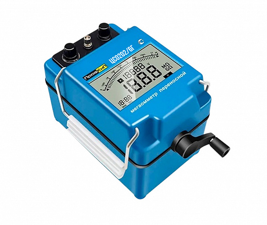 Мегаомметры переносные ПрофКиП ЦС0202/6Г предназначены для измерения электрического сопротивления постоянного тока при проверке параметров изоляции. Мегаомметры применяются для оперативного контроля сопротивления и параметров изоляции, при настройке, испытаниях и обслуживании промышленного оборудования и электросетей, оснащения мастерских, предприятий и организаций, обслуживающих электросети. Особенностью мегаомметров ПрофКиП ЦС0202/6Г является отсутствие необходимости использовать стороннее питание в виде гальванических элементов, батарей аккумуляторов и т д, так как питание электронной схемы и элементов ЖК дисплея осуществляется от генератора с механическим приводом. Приборы выпускаются в качестве современной замены мегаомметров серий М4100, ЭСО202, ЦС0202 украинского производства |
