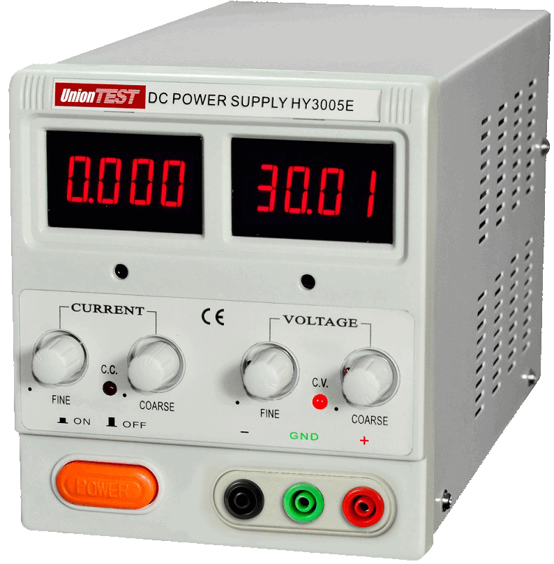UnionTest HY3005E (прежнее название Mastech HY3005E) – импульсный источник питания, позволяющий получать регулируемое, точное и стабильное постоянное напряжение или постоянный ток. Две пары регуляторов грубой и точной настройки облегчают установку напряжения и тока, а цифровые светодиодные индикаторы тока и напряжения упрощают считывание параметров выхода.