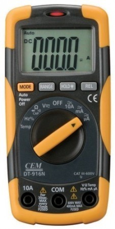Мультиметр цифровой DT-916 позволяет также измерять ток (10 A), сопротивление (40MОм), выполнять тест диодов и проверку цепей на обрыв, измерять емкость конденсаторов (100 мкФ), частоту (10 мГц). Отличительной особенностью данной модели является наличие термопары типа К для определения температуры до 760°С даже в самых труднодоступных местах.