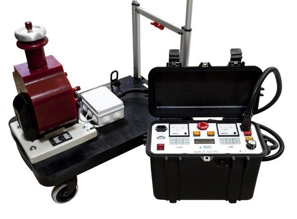 Высоковольтная испытательная установка АИСТ 50/70М с "сухим" трансформатором предназначена для испытания оборудования высоким напряжением до 50кВ переменного тока и 60кВ постоянного тока.