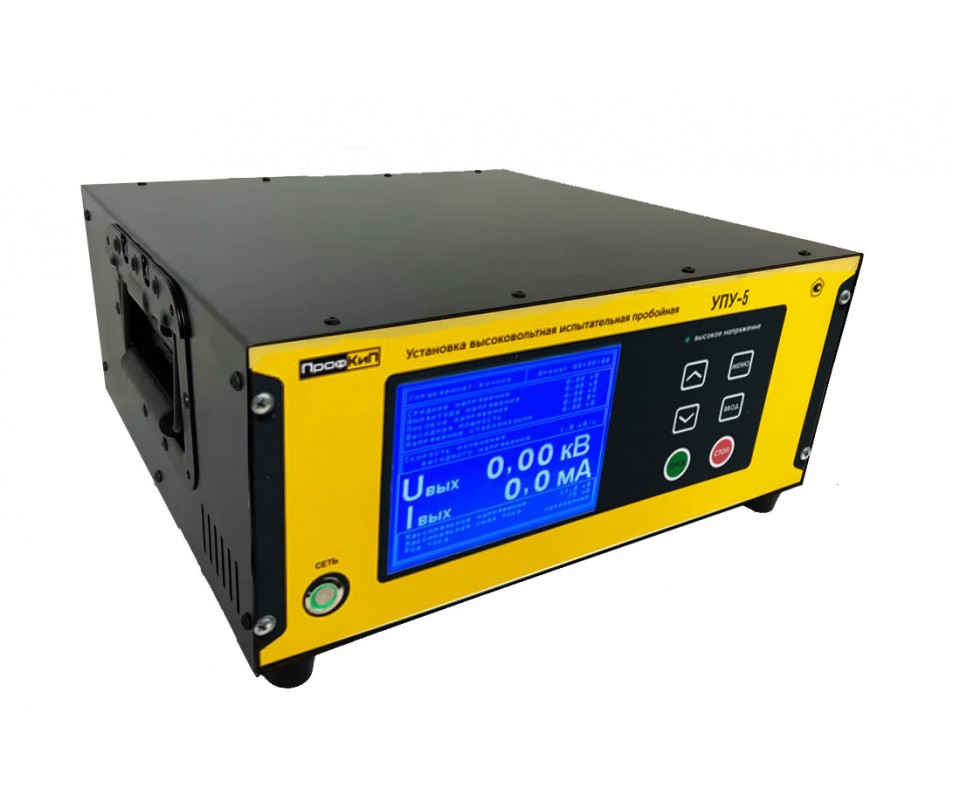 Установка высоковольтная испытательная пробойная ПрофКиП УПУ-5 - предназначена для генерирования напряжения постоянного и переменного тока синусоидальной формы частотой 50 Гц, а также для измерения напряжения и силы переменного и постоянного токов при проведении испытаний и диагностировании изоляции силовых кабелей, изоляции электрооборудования, ограничителей перенапряжений, твердых диэлектриков, средств защиты и т.д.