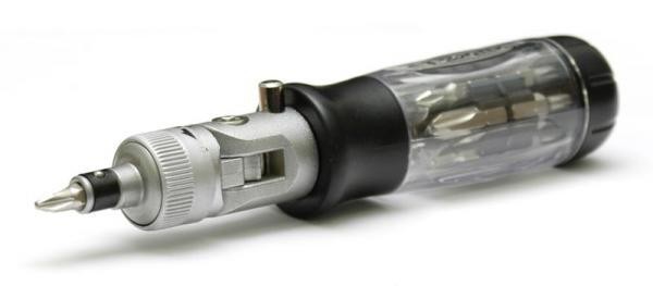 Прецизионная отвертка с храповым механизмом АНТ-5021 и изменяемым в 5 положений наклоном рукоятки (0; 45; 90; 135; 180 градусов). Отвертка имеет отсек для хранения сменных насадок с 10 односторонними сменными насадками (M4 - 7х25 мм), четырехгранный адаптер, миниотвретку с двумя двухсторонними прецизионными насадки (M2 - 4х25 мм) .