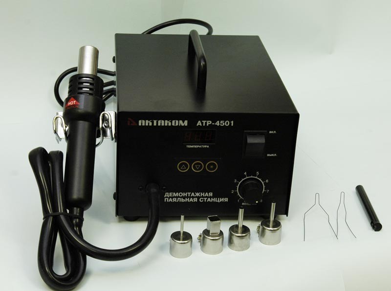 Паяльная станция АТР-4501 : Монтаж-демонтаж электронных компонентов горячим воздухом. Станция 320 Вт, регулировка t=100...480°C, насос диафрагменного типа. Антистатическая защита.