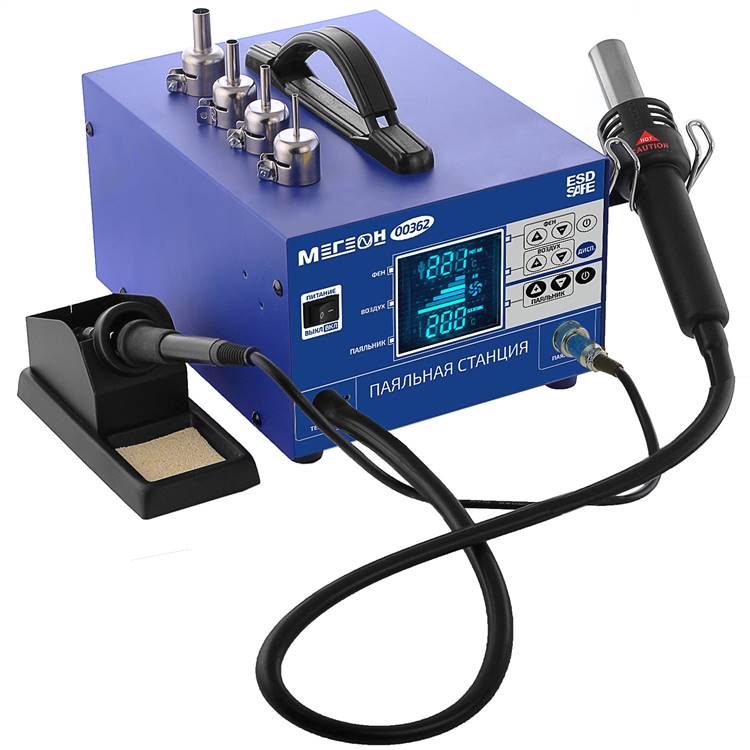 МЕГЕОН 00362 - новинка в модельном ряду паяльных станций. Прибор специально создан для лужения и распайки большого количества электрокомпонентов. Термофен предназначен для: применения с термоусадочными трубками, предварительным прогревом, сушкой, пластической пайки, удаления наклеек и краски, стерилизации и выпаивания мельчайших SMD - компонентов. С целью упрощения пользования и проведения направленного нагрева предусмотрены четыре насадки с калиброванными проходными каналами. Микроконтроллерное управление совместно с термодатчиками максимально упрощают эксплуатацию изделия. Функция интеллектуального охлаждения фена увеличивает срок службы нагревательного элемента. Быстрый разогрев и стабильная температура с разрешением до 1°С делают работу с бессвинцовыми припоями предельно простой и безопасной. Паяльник имеет распространённый типоразмер жала 900М-Т, что даёт возможность использования до 19 видов различных наконечников для выполнения требуемых задач.