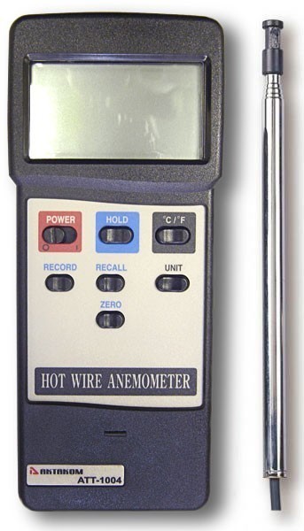 Современная модель термоанемометра с возможностью температурных измерений, работающая по принципу охлаждения воздушным потоком нагретой нити. Датчик — миниатюрный стеклянный термистор — размещается в малогабаритной измерительной головке диаметром 12 мм на телескопической ручке. Обеспечивает быстрые и точные измерения даже при низком значении скорости движения воздушного потока. Прибор отображает измеренные значения во всех принятых единицах измерения (м/с, км/ч, футы/мин, узлы, мили/час). Последнее, максимальное и минимальное измеренные значения могут сохраняться в памяти автоматически.