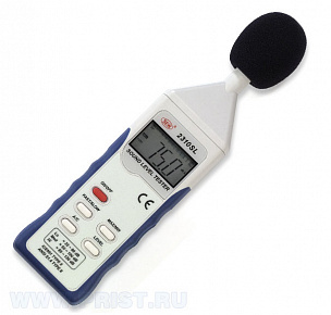 Измеритель шума. 30…130 дБ (разрешение 0,1 дБ); полоса частот 31,5 Гц…8 кГц; динамич. диапазон 100 дБ; фильтры А, С; измерение быстро (125 мс)/ медленно (1 с); цифр. жк-индикатор (3 ½) и линейная шкала; регистрация МИН/МАКС значений, ручной выбор предела; внешний выход преобразователя; противоударная накладка-держатель, масса 224 г.