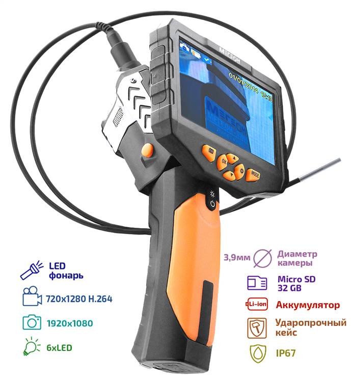 МЕГЕОН 33500-139 - новинка в модельном ряду цифровых видеоскопов, предназначенный для решения задач в быту и промышленности. Эндоскоп представляет собой устройство для исследования и осмотра скрытых от глаза полостей с возможностью сохранения видеоизображения со звуком на встроенный носитель SDHC 32Гб. Помимо этого предусмотрено получение цветных изображений с помощью фотографий. Большой ЖК-дисплей с разрешением 854 х 480 и диагональю 4,3' отчётливо отобразит всё происходящее перед камерой. Зонд диаметром 3,5 мм и длиной 1 метр имеет жёсткую конструкцию. Подсветка оснащена шестью яркими светодиодами со ступенчатой регулировкой яркости, которые обеспечивают работу в условиях полного отсутствия освещения. Дополнительно в корпусе предусмотрена подсветка с высокой интенсивности свечения, которая с лёгкость заменит фонарик. Преимущества изделия по достоинству смогут оценить профессионалы и любители.